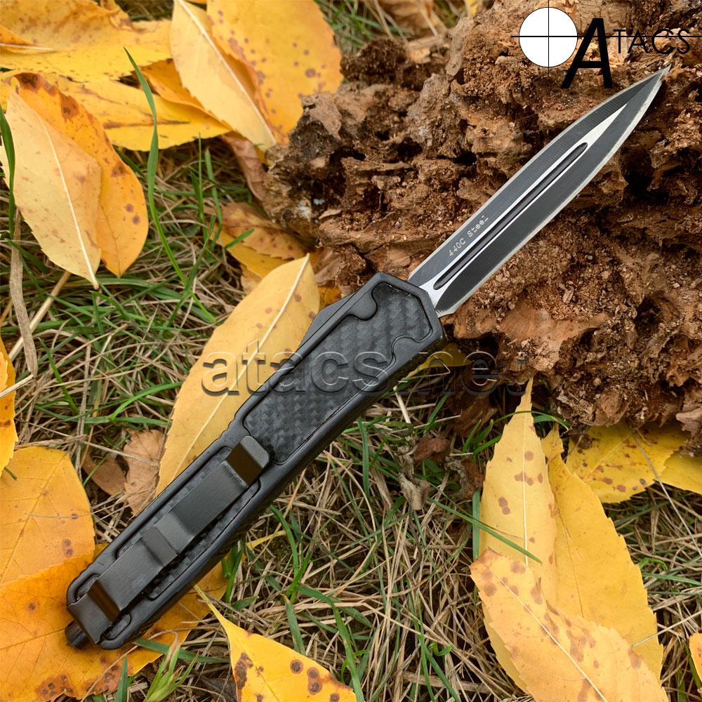 Надійності хвата і комфорту утримання сприяють спеціальні виступи і насічки для пальців на рукояті. Також корпус ножа прикрашений і захищений плівкою з карбоновим паттерном. Безумовно, це – додатковий плюс до стильності выкидного ножа.
